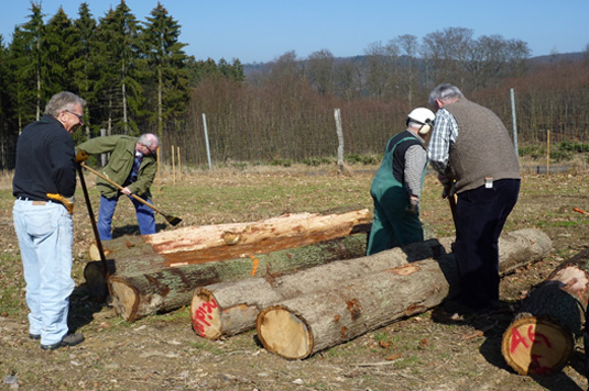 Mitglieder der LimesArbeitsgruppe schälen die Eichenstämme, die zu Palisaden werden. |