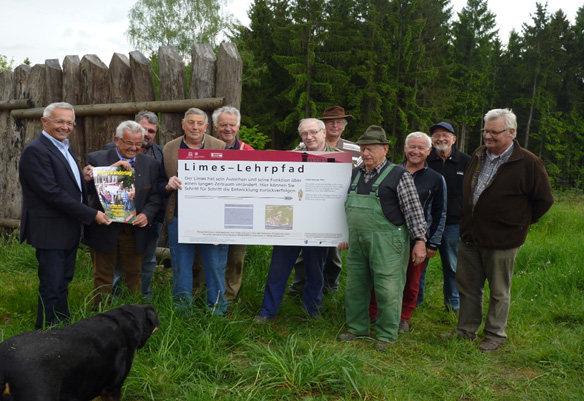 und Mitglieder der LimesArbeitsgruppe präsentieren nach Fertigstellung der baulichen Anlagen die erste Infotafel zum Limes-Lehrpfad.
