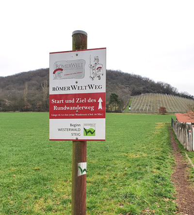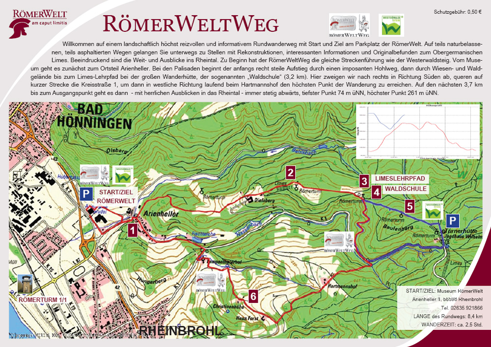 Der RömerWeltWeg führt als Rundwanderweg vom Parkplatz der RömerWelt am caput limitis aus zu den Resten des Obergermanisch-Raetischen Limes im Rheinbrohler Wald.